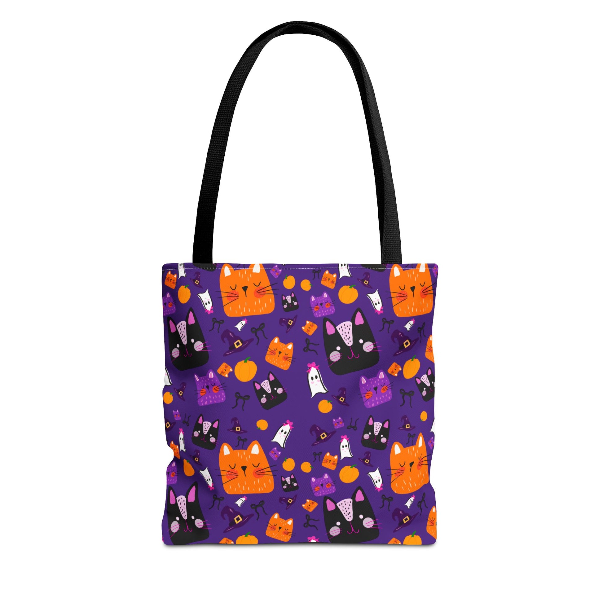 Halloween Cat Tote Bag, Cute Purple Shopping Bag, Halloween Gift, Cat Lover Accessory, Fun Everyday Bag, AOP Bag
